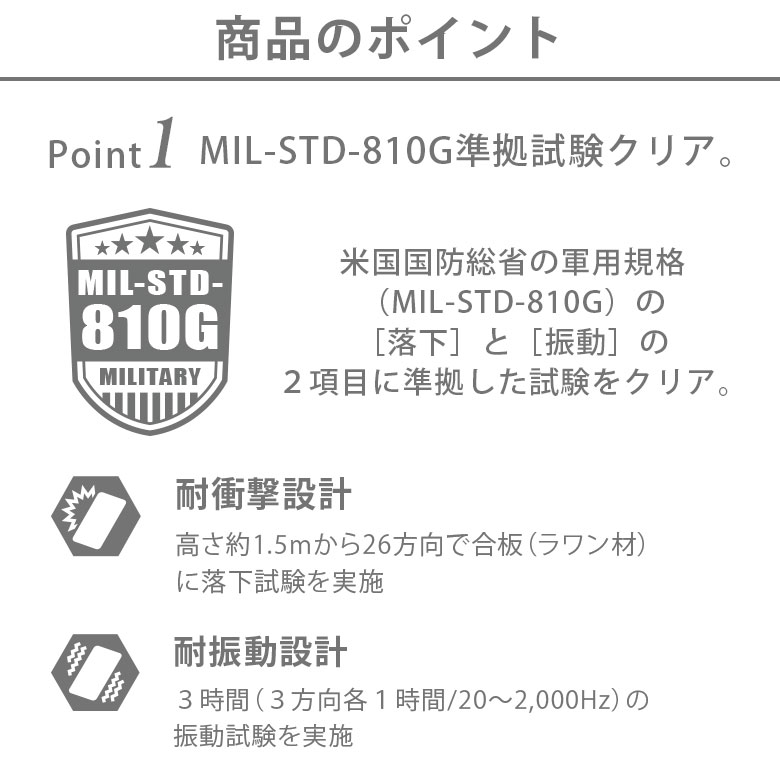MIL規格(MIL-STD-810G)の2項目、落下、振動に準拠した試験をクリアしたタフ設計。